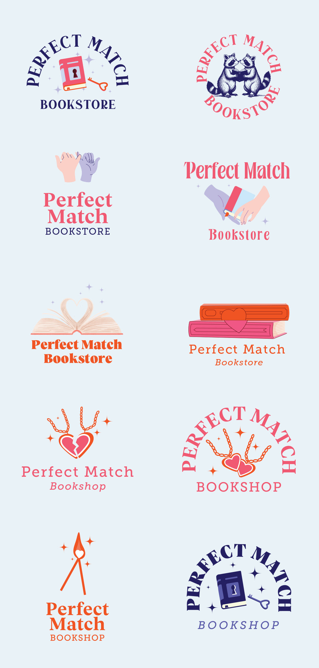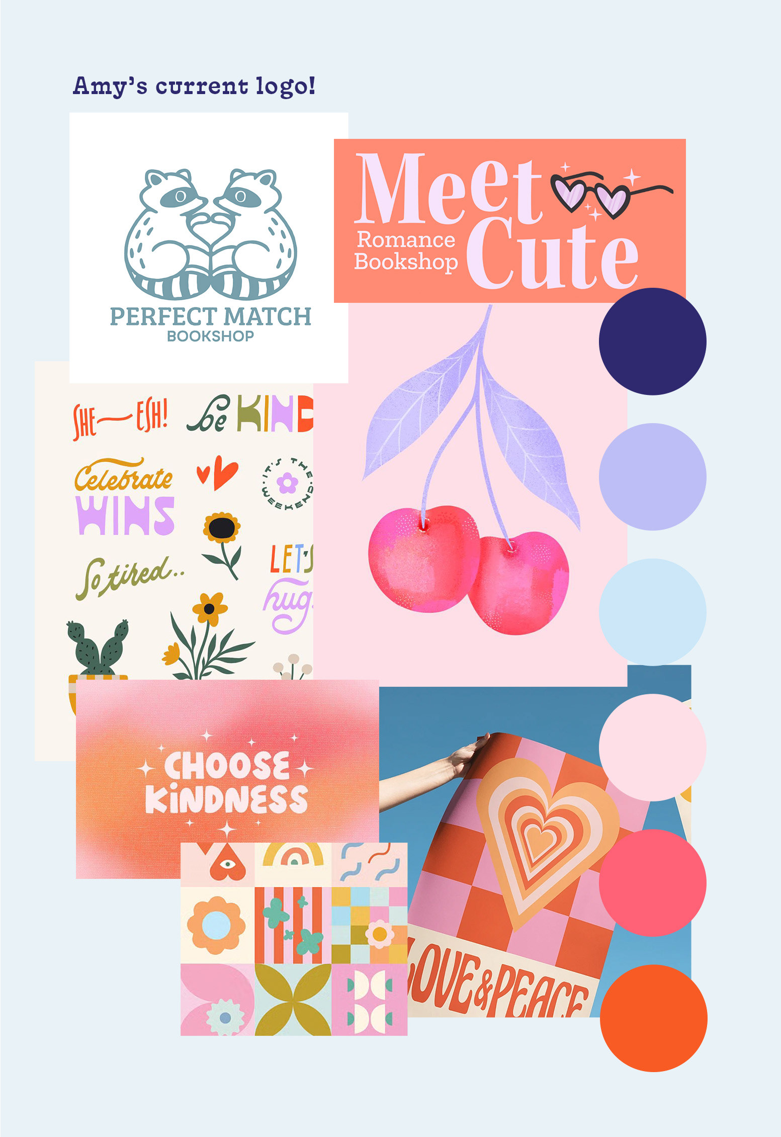 Amy came to me with a vision for Perfect Match Bookshop, a romance-forward, joy-driven space for women and queer readers, but the visual direction was still evolving. She brought a playful moodboard (hearts, friendship necklaces, florals, raccoons) and a clear list of what she wanted to avoid, no red, nothing too gendered, and no obvious matchstick references.